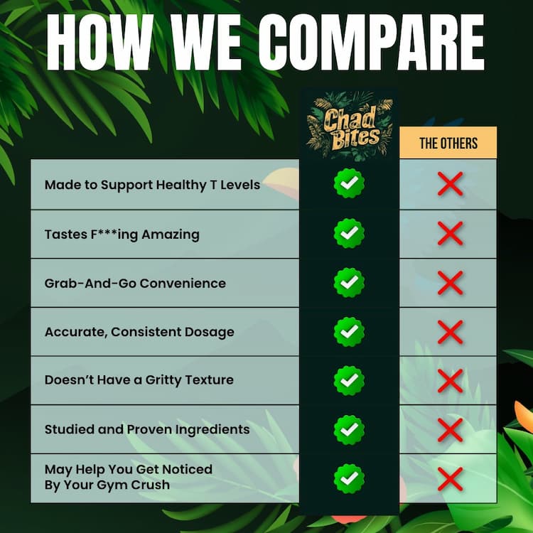 - Boosts Natural Testosterone* Packed with powerful, natural ingredients, Chad Bites help to elevate your testosterone levels, giving you the physical and mental edge you need.